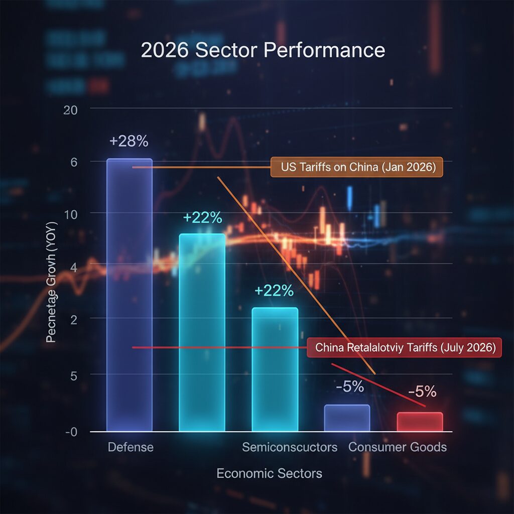 Image Placement 1: Vibrant chart showing 2026 sector performance spikes in defense (+28%) and semiconductors (+22%) vs. laggard consumer goods (-5%), with US-China tariff timelines overlaid.