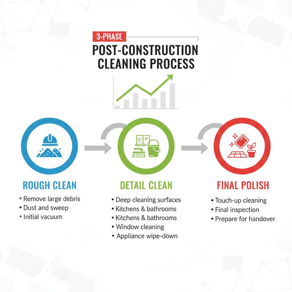 Top cleaners divide the job into **Rough Clean**, **Detail Clean**, and **Final Polish** to avoid re-contaminating surfaces— a method Karen’s Green Cleaning credits for zero dust fallout[4]. Phase 1: Haul out debris with heavy-duty bags (like Husky 42-gallon contractors bags, $15/pack at Home Depot). Phase 2: Scrub with neutral pH solutions (e.g., Method All-Purpose Cleaner, $4/bottle, safe for new paint). Phase 3: Shine with glass polish like Invisible Glass, $6, for streak-free results[6].