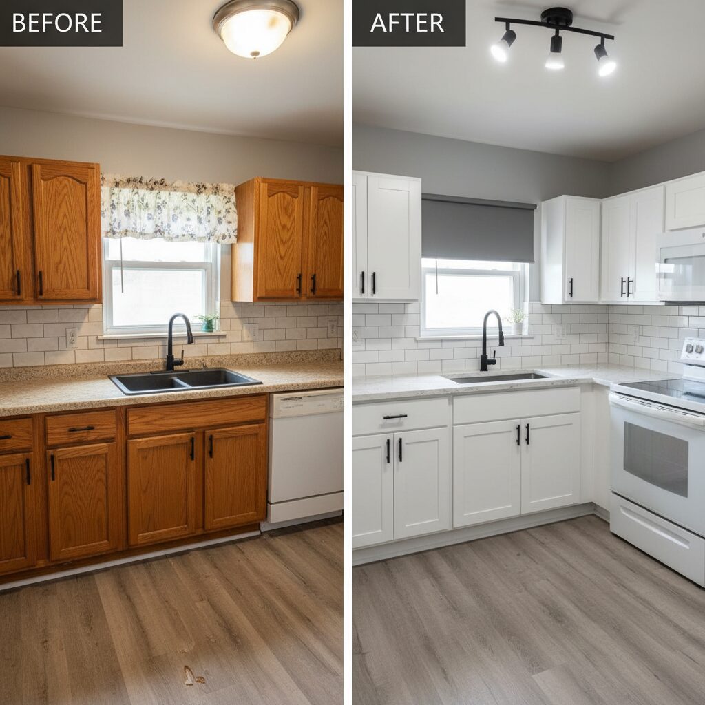 *(Image: Before-and-after of a medium kitchen refaced with RTF thermofoil doors, matte black hardware, and white shaker fronts—dramatic transformation highlighting budget materials at $5K level)*